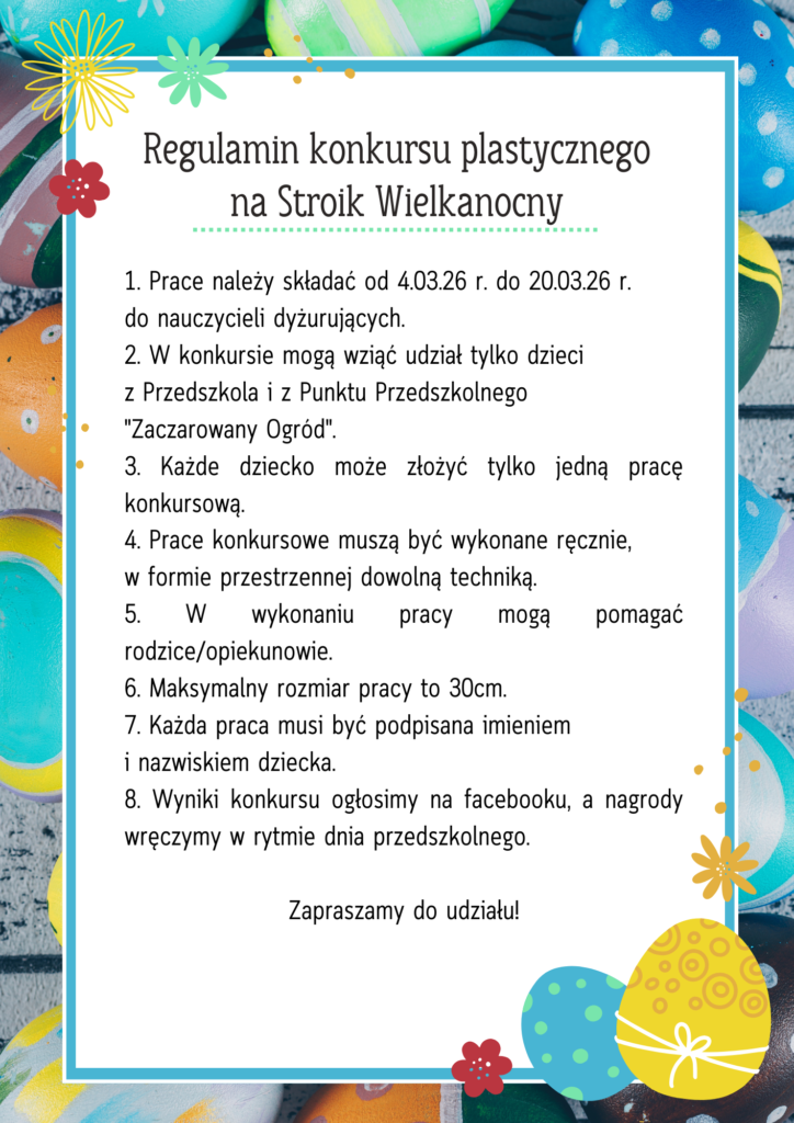 Wystartował przedszkolny konkurs plastyczny na Stroik Wielkanocny! Zapraszamy do zapoznania się z załączonym regulaminem i do wzięcia udziału.